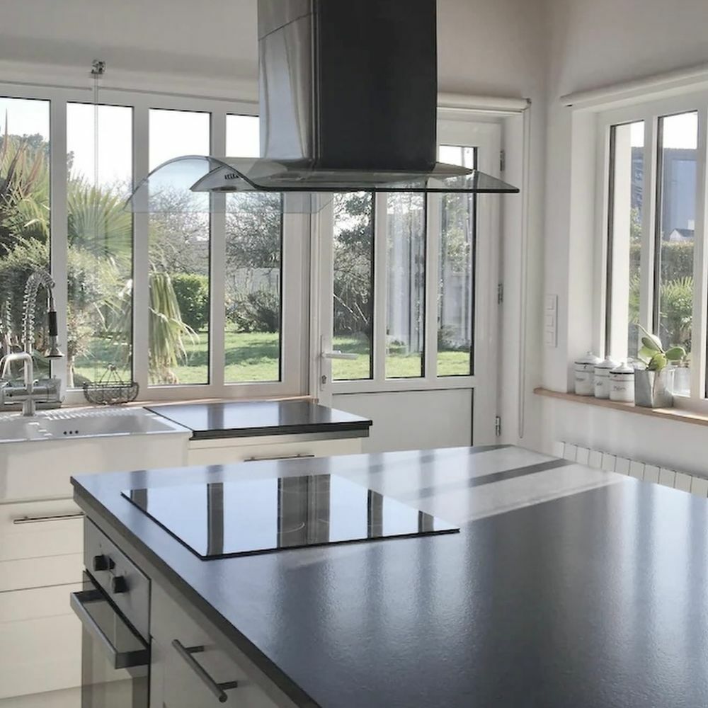 Sie ist mit einer großen Kochinsel ausgestattet, von der aus man einen direkten Blick auf den Wohn- und Essbereich hat.