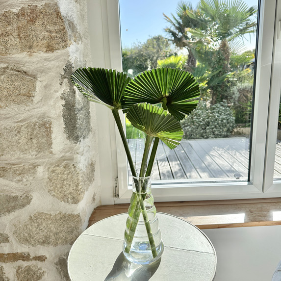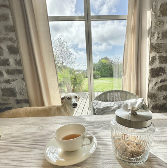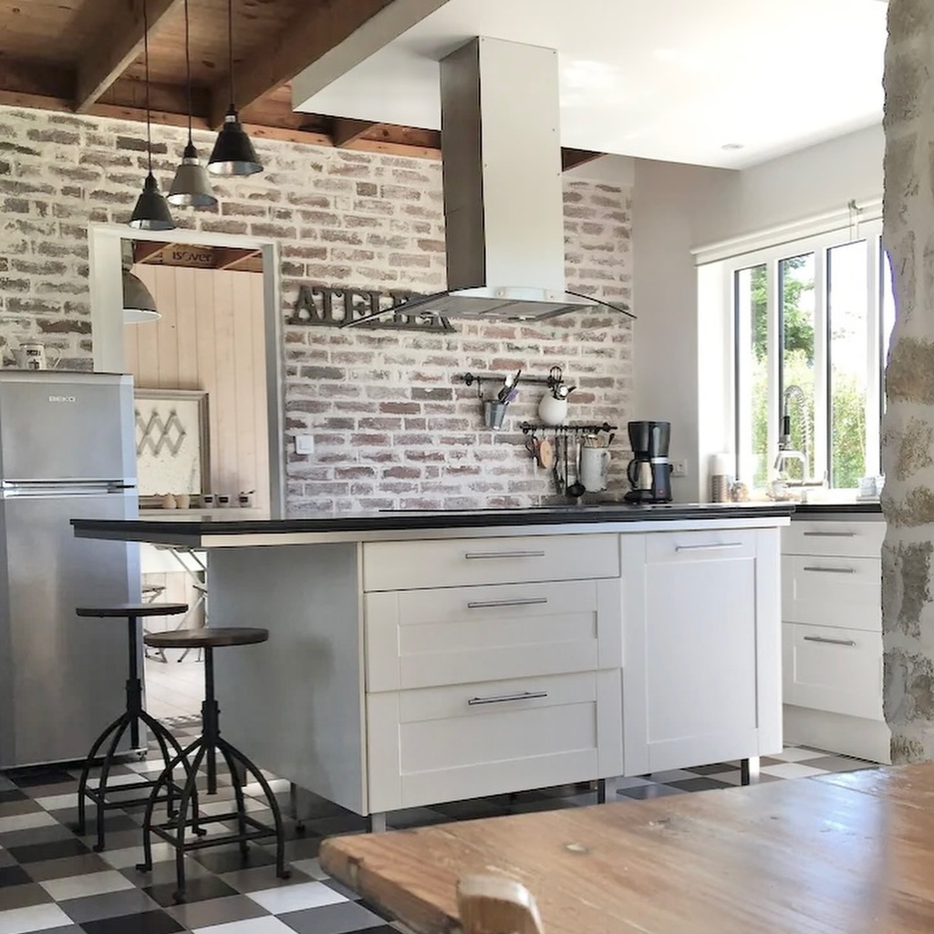 Die Küche im Maison Tarte au Miel ist ein weiteres Highlight des Ferienhauses und besticht durch ihre einzigartige Gestaltung. Sie befindet sich in einer Art Wintergarten, ist rundum von Fenstern umgeben und bietet somit einen traumhaften Blick in den wunderschönen Garten.