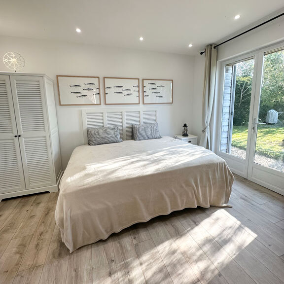 Die Schlafzimmer befindet sich im Erdgeschoss, es ist lichtdurchflutet und bieten einen wunderschönen Blick in den Garten und auf den Olivenbaum. Das gemütliche Bett von 160 x 200 cm mit einer bequemen Einstiegshöhe sorgt für erholsame Nächte und ein bequemes ein und aussteigen. Das Zimmer No.3 verfügt über eine Fußbodenheizung. Eine große doppelflügelige Terassentür mit direktem Ausgang zum Garten runden dieses traumhafte Zimmer ab. Ein "Scheunentor" zum schieben bieten Schutz vor zu viel Licht und ermöglichen einen entspannten Schlaf. Im Erdgeschoß befindet sich auch ein WC.