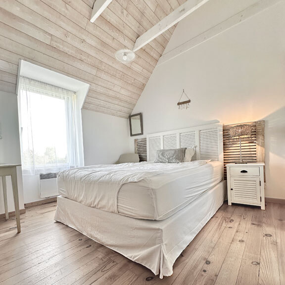 Die Schlafzimmer sind lichtdurchflutet und bieten einen wunderschönen Blick in den Garten. Das gemütliche Bett von 140 x 200 cm mit einer Einstiegshöhe von 62 cm sorgt für erholsame Nächte und ein bequemes ein und austeigen. Das Badezimmer ist en Suite und verfügt über eine Dusche und ein Waschbecken. Rolläden bieten Schutz vor zu viel Licht und ermöglichen einen entspannten Schlaf. Auf der gleichen Etage befindet sich ein WC.