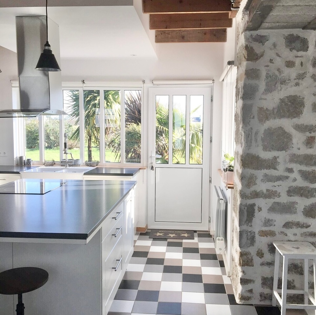 Die Küche im Maison Tarte au Miel ist ein weiteres Highlight des Ferienhauses und besticht durch ihre einzigartige Gestaltung. Sie befindet sich in einer Art Wintergarten, ist rundum von Fenstern umgeben und bietet somit einen traumhaften Blick in den wunderschönen Garten.